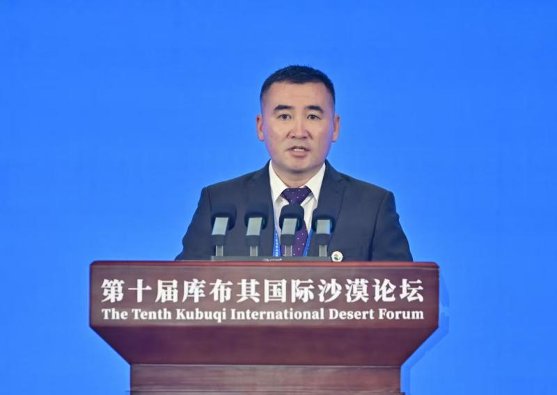 9月16日,蒙古國政府直屬國家林業(yè)局局長賓·奧云薩那在第十屆庫布其國際沙漠論壇開幕式上致辭。草原云·內蒙古新聞網(wǎng)記者 馬建兵 攝