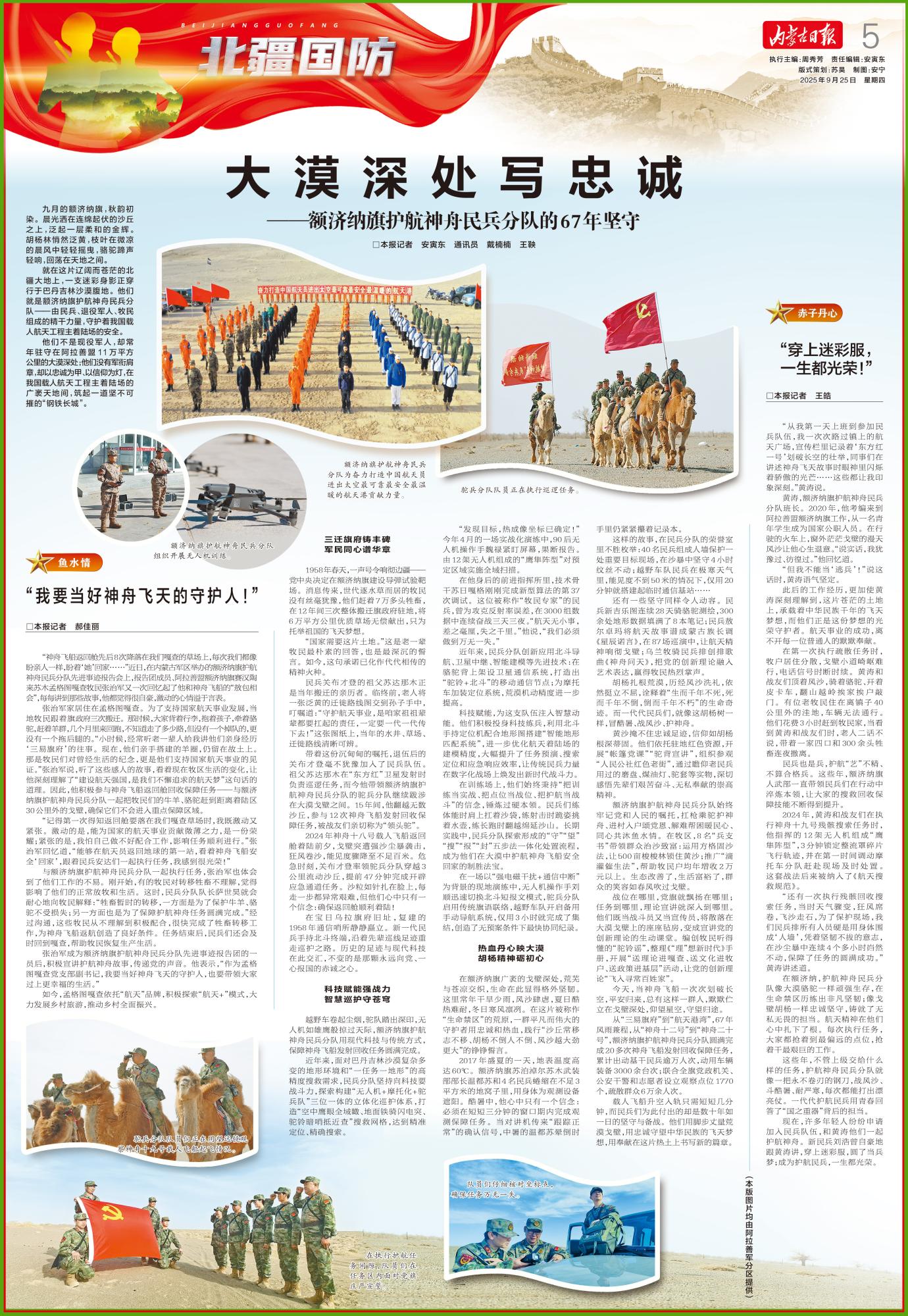還有一些堅守同樣令人動容。民兵新吉樂圖連續(xù)28天騎駱駝測繪,300余處地形數(shù)據(jù)填滿了8本筆記;民兵敖爾卓瑪將航天故事譜成蒙古族長調(diào)《星辰諾言》,在87場巡演中,讓航天精神響徹戈壁;烏蘭牧騎民兵排創(chuàng)排歌曲《神舟問天》,把黨的創(chuàng)新理論融入藝術(shù)表達(dá),贏得牧民熱烈掌聲。
