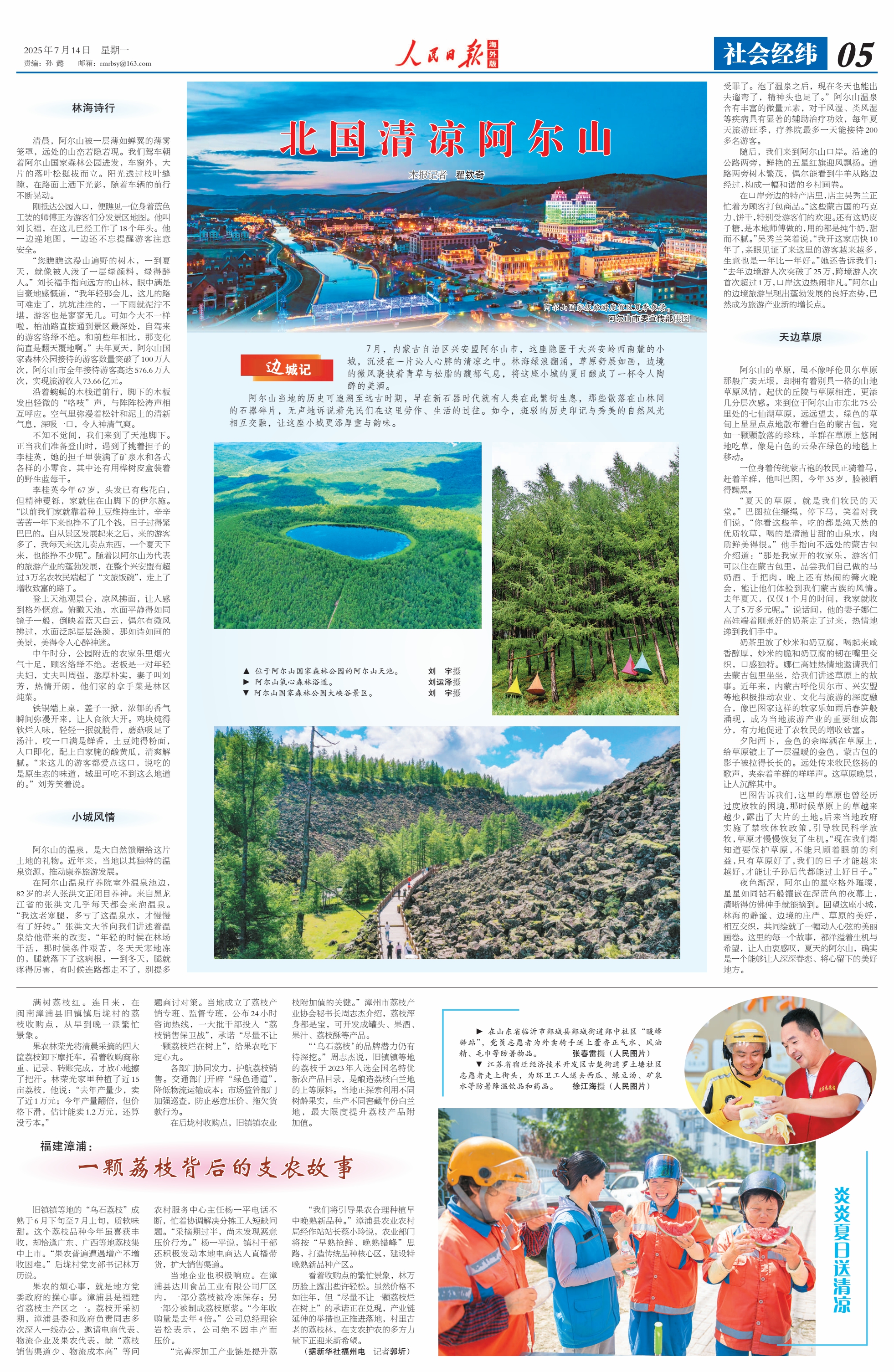 2025年7月14日《人民日?qǐng)?bào)海外版》第5版刊發(fā)了題為《北國(guó)清涼阿爾山》的文章,報(bào)道了7月,內(nèi)蒙古自治區(qū)興安盟阿爾山市,這座隱匿于大興安嶺西南麓的小城,沉浸在一片沁人心脾的清涼之中。林海綠浪翻涌,草原舒展如畫,邊境的微風(fēng)裹挾著青草與松脂的馥郁氣息,將這座小城的夏日釀成了一杯令人陶醉的美酒。