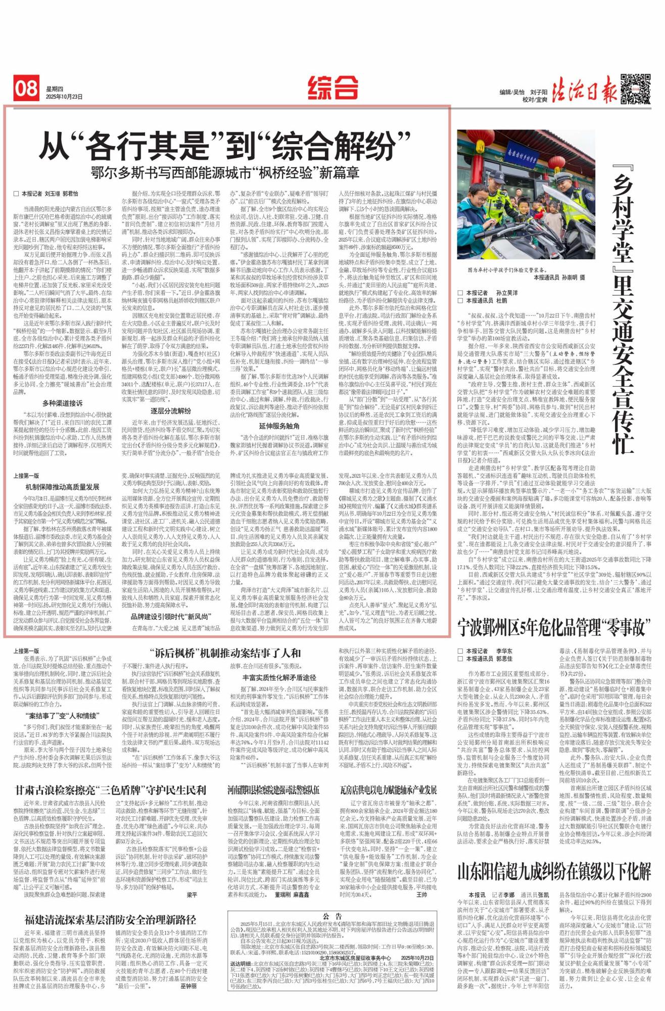 2025年10月23日,《法治日?qǐng)?bào)》第8版刊發(fā)題為《從“各行其是”到“綜合解紛”鄂爾多斯書寫西部能源城市“楓橋經(jīng)驗(yàn)”新篇章》的文章,報(bào)道了鄂爾多斯市以綜治中心規(guī)范化建設(shè)為核心,深入踐行新時(shí)代“楓橋經(jīng)驗(yàn)”,通過(guò)多元舉措化解矛盾糾紛,全力打造“暖城善治”社會(huì)治理品牌。截至9月底,全市各級(jí)綜治中心累計(jì)受理各類矛盾糾紛22371件,化解率達(dá)96.03%。