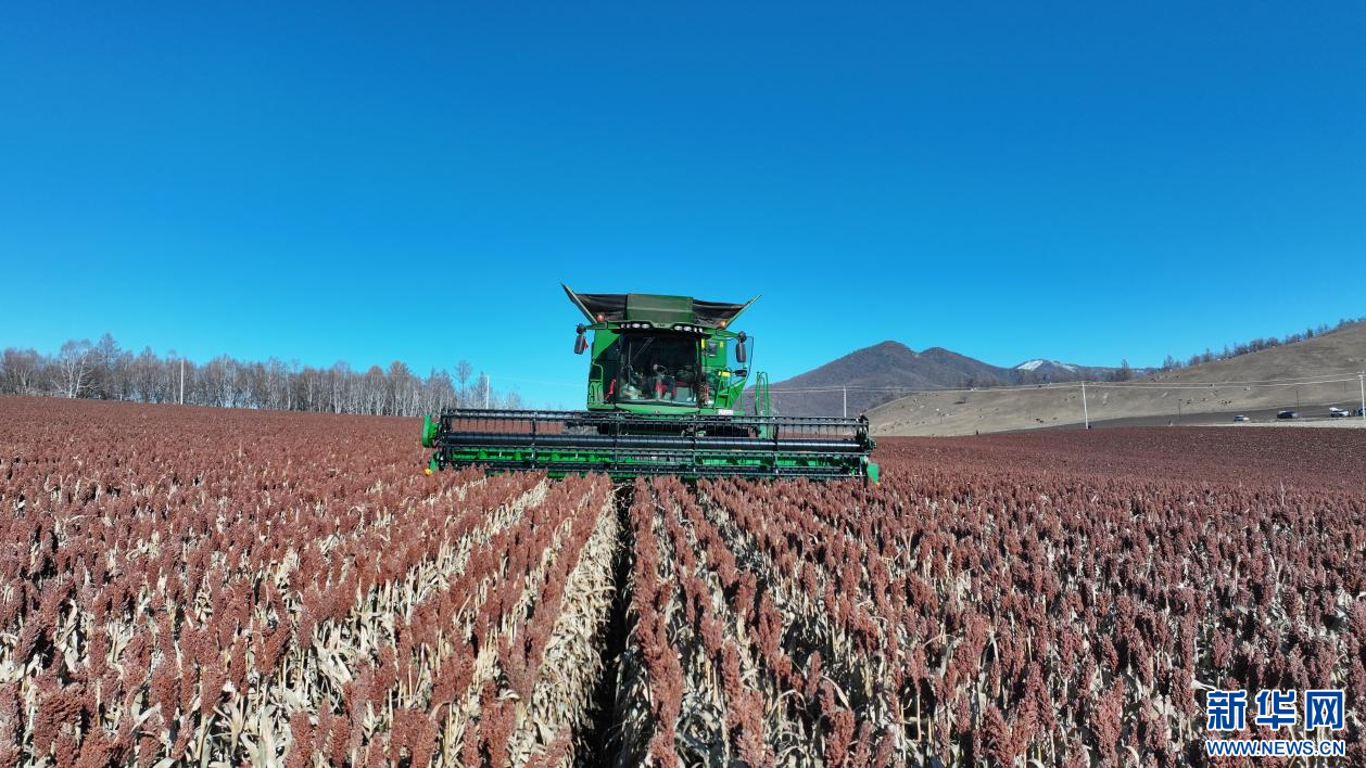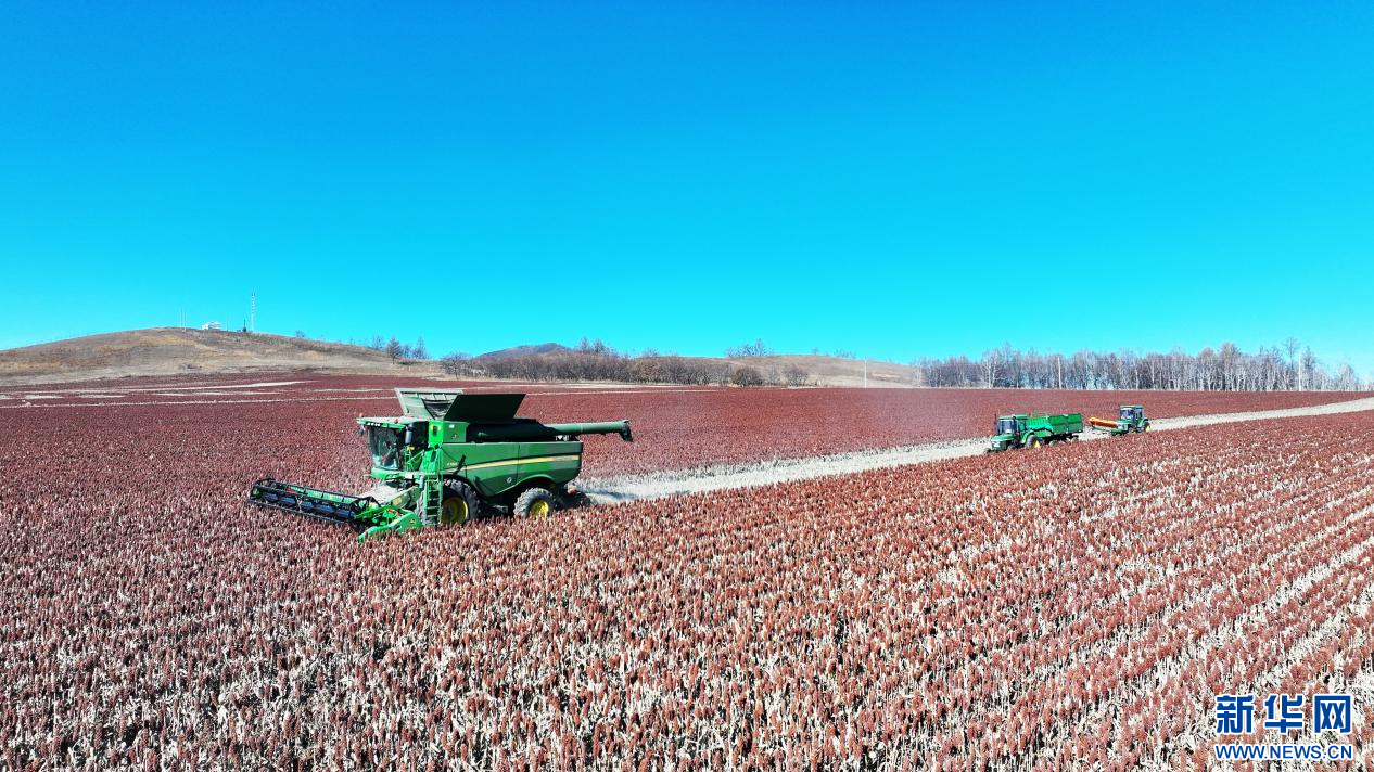 ??10月22日,在內(nèi)蒙古自治區(qū)呼倫貝爾農(nóng)墾綽爾河農(nóng)牧場有限公司田間,農(nóng)場員工正在收獲高粱。新華網(wǎng)發(fā)(哈園碩 攝)