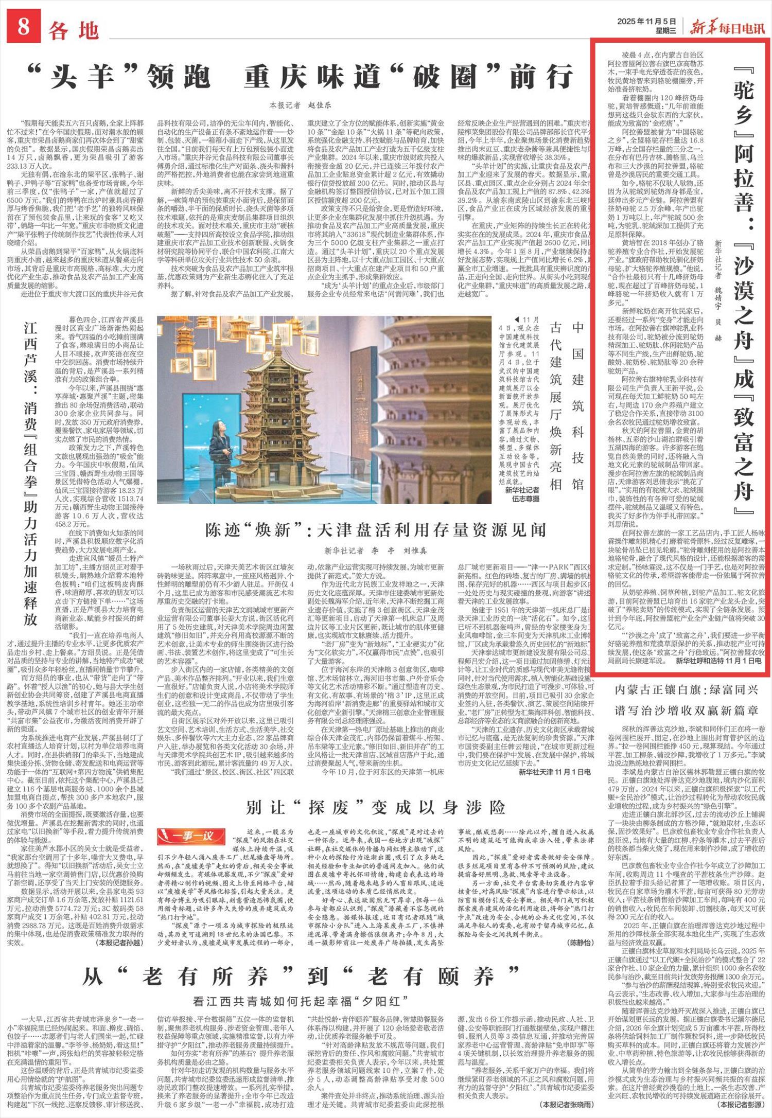 2025年11月5日,《新華每日電訊》第8版刊發(fā)題為《“駝鄉(xiāng)”阿拉善:“沙漠之舟”成“致富之舟”》的文章,報道了阿拉善盟被譽為“中國駱駝之鄉(xiāng)”,駱駝存欄量達16.8萬峰,占全國存欄量的三分之一。預計到今年底,阿拉善盟駝產(chǎn)業(yè)全產(chǎn)業(yè)鏈產(chǎn)值將突破30億元。
