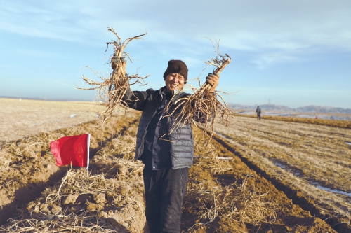 種植戶展示收獲的黃芪。蘭正武 攝