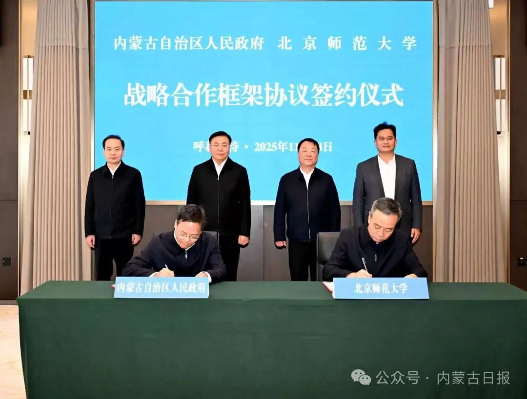 11月18日,自治區(qū)黨委副書記、自治區(qū)人民政府主席包鋼與北京師范大學黨委書記程建平共同見證自治區(qū)人民政府與北京師范大學簽署戰(zhàn)略合作框架協(xié)議。草原云·內(nèi)蒙古新聞網(wǎng)記者 韓卿立 攝