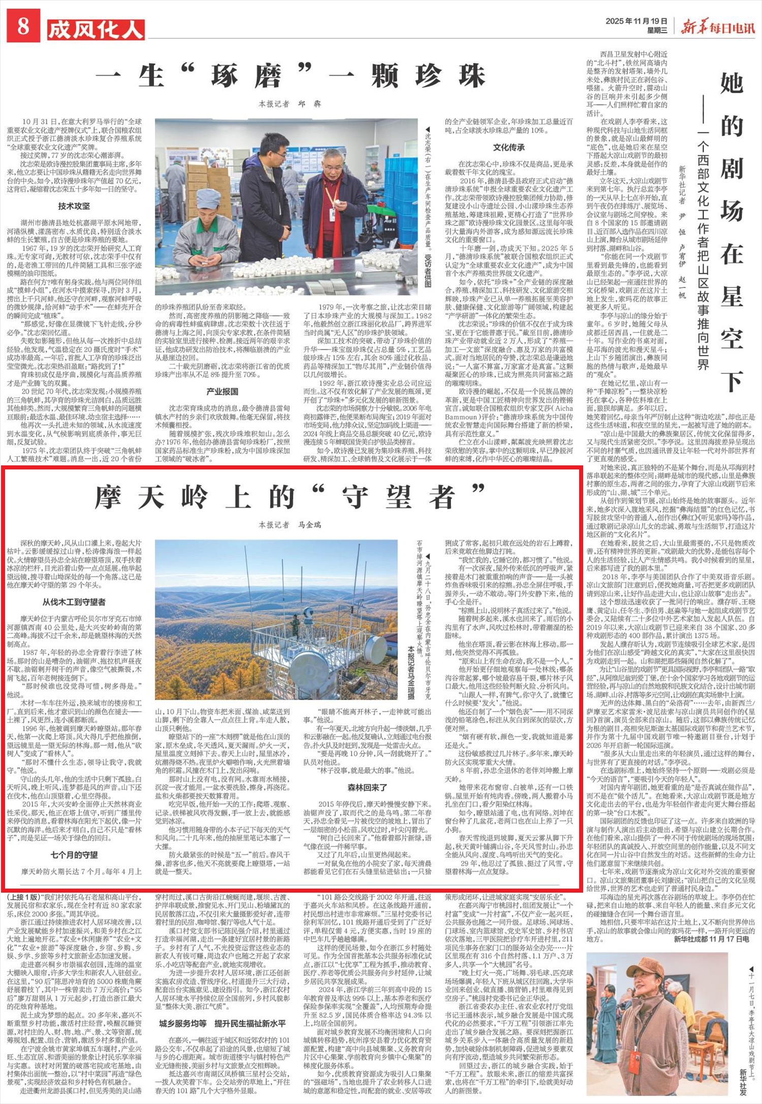 2025年11月19日,《新華每日電訊》第8版刊發(fā)題為《摩天嶺上的“守望者”》的文章,報道了摩天嶺位于內(nèi)蒙古呼倫貝爾市牙克石市綽河源鎮(zhèn)西南40公里處,是大興安嶺嶺南的第二高峰。火情瞭望員孫忠全站在瞭望塔頂,雙手扶著冰涼的欄桿,目光沿著山勢一點點延展。他舉起望遠鏡,搜尋著山坳深處的每一個角落。這已是他在摩天嶺守望的第29個年頭。