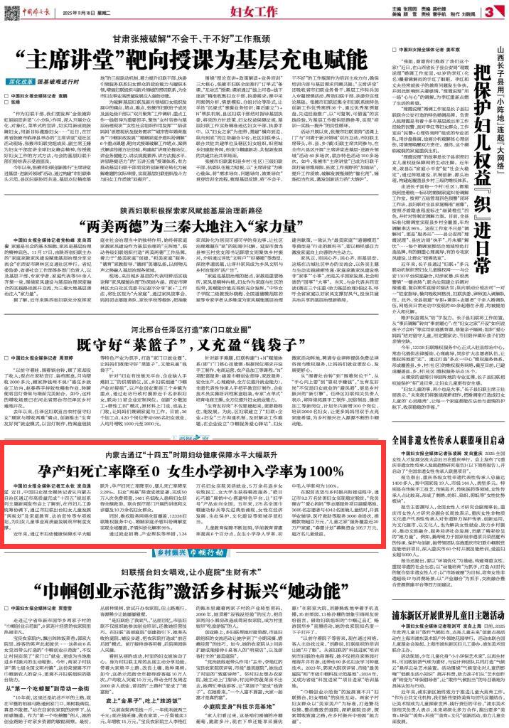 2025年11月18日《中國婦女報(bào)》第3版刊發(fā)了《內(nèi)蒙古通遼“十四五”時(shí)期婦幼健康保障水平大幅躍升 孕產(chǎn)婦死亡率降至0 女生小學(xué)初中入學(xué)率為100%》的文章,報(bào)道了近年來,通遼市婦幼健康保障水平大幅躍升,孕產(chǎn)婦死亡率降至0,嬰兒死亡率降至2.28‰。婦女“兩癌”篩查成效顯著,完成50萬人次免費(fèi)篩查,1461名低收入患病婦女獲得全額救助。聯(lián)合醫(yī)療部門開展的講座和義診惠及10萬余名婦女群眾。