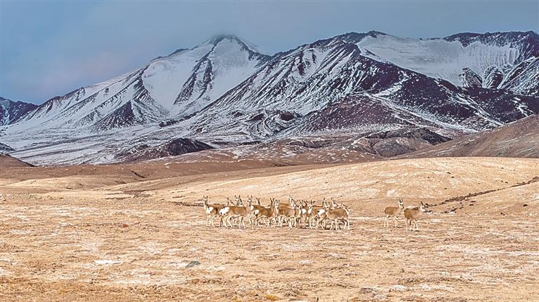 冬日,國家二級保護(hù)野生動物藏原羚在甘肅省阿克塞縣阿勒騰鄉(xiāng)哈爾騰草原活動覓食。新華社發(fā)