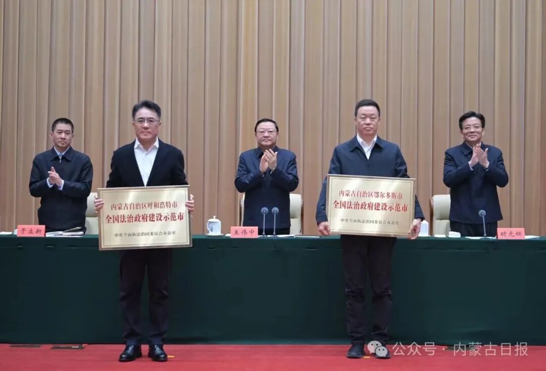 自治區(qū)黨委副書記、自治區(qū)黨委全面依法治區(qū)委員會(huì)副主任時(shí)光輝主持會(huì)議。自治區(qū)黨委、人大常委會(huì)、政府、政協(xié)有關(guān)領(lǐng)導(dǎo)同志和法檢“兩長”出席。會(huì)議為自治區(qū)獲評(píng)第三批全國法治政府建設(shè)示范地區(qū)的呼和浩特市、鄂爾多斯市授牌。