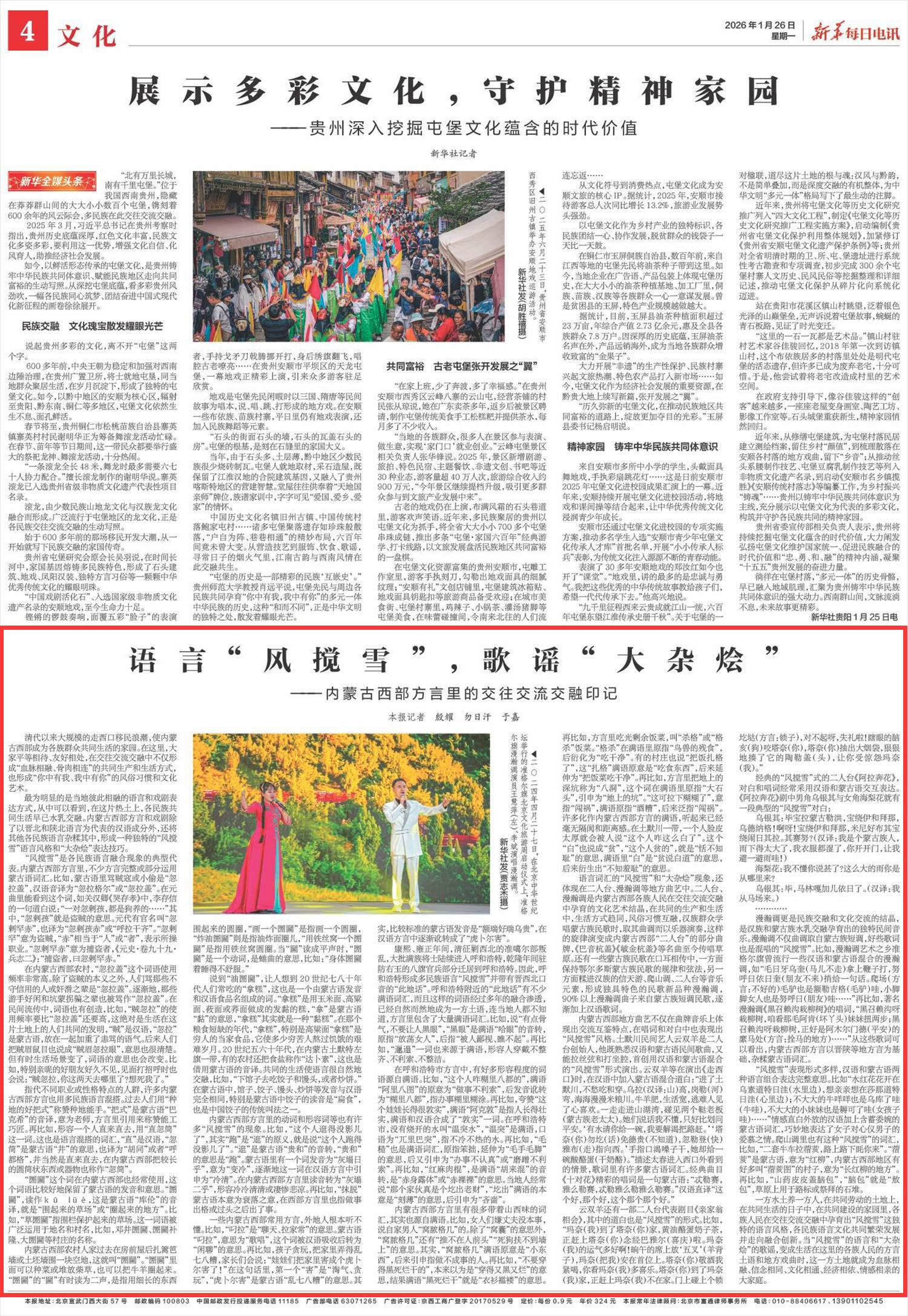 2026年1月26日《新華每日電訊》第4版刊發(fā)了《語言“風(fēng)攪雪”,歌謠“大雜燴”——內(nèi)蒙古西部方言里的交往交流交融印記》的文章,報道了內(nèi)蒙古西部方言和戲劇除了以晉北和陜北語言為代表的漢語成分外,還將其他各民族語言雜糅其中,形成一種獨(dú)特的“風(fēng)攪雪”語言風(fēng)格和“大雜燴”表達(dá)技巧。