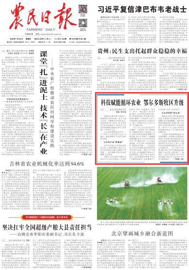 2026年1月29日,《農(nóng)民日報(bào)》頭版刊發(fā)題為《科技賦能循環(huán)農(nóng)業(yè) 鄂爾多斯牧區(qū)升級》的文章,報(bào)道了在內(nèi)蒙古鄂爾多斯市祖祖輩輩“靠天吃飯、逐水草而居”的傳統(tǒng)被改寫,取而代之的是科技賦能的精細(xì)化種養(yǎng),是貫通三產(chǎn)的新興業(yè)態(tài)。越來越多的農(nóng)牧民,正沿著“新一產(chǎn)”鋪就的這條路,走向收入更穩(wěn)、底氣更足的好日子。