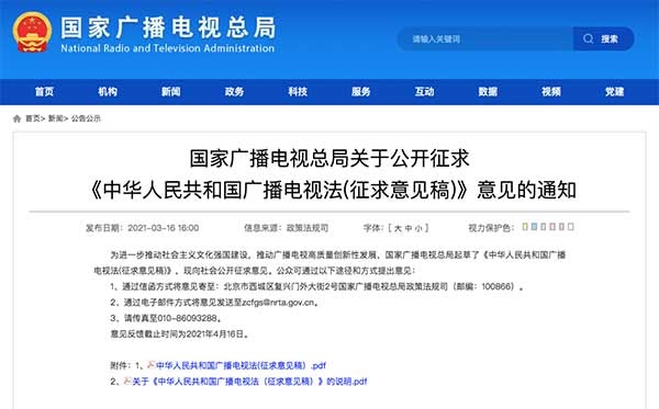 3月16日,國(guó)家廣播電視總局發(fā)布《中華人民共和國(guó)廣播電視法(征求意見稿)》(以下簡(jiǎn)稱“征求意見稿”),向社會(huì)公開征求意見。征求意見稿分為總則、業(yè)務(wù)準(zhǔn)入、制作播放、傳輸覆蓋、公共服務(wù)、扶持促進(jìn)、安全保障、監(jiān)督管理、法律責(zé)任和附則,共10章80條。意見反饋截止日期為2021年4月16日。