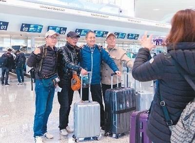 2月8日,前往印尼巴厘島的旅行團游客在浙江杭州蕭山國際機場T4航站樓拍照留念。 龍 巍攝(人民圖片)