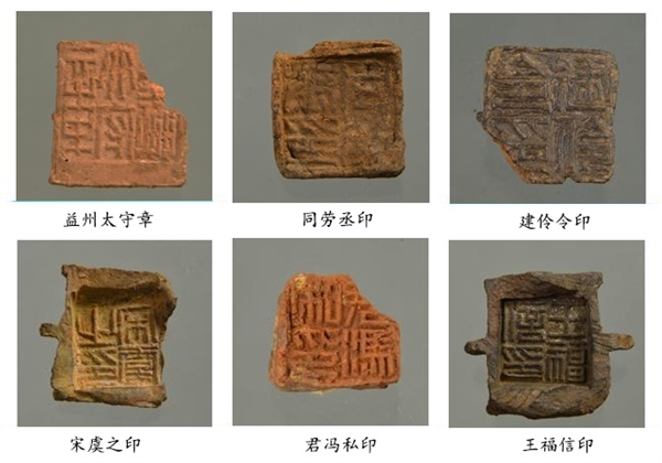 封泥集中出土于北部發(fā)掘區(qū)東北角的河道廢棄堆積中,共計(jì)837枚。主要為官印封泥和私印封泥,其中官印封泥有“益州太守章”“建伶令印”“同勞示印”等,涵蓋了漢代益州郡 24 縣中的20個(gè)縣名。出土帶字簡牘殘片 1000 余枚,不帶字的簡牘殘片近萬枚。其中,帶字簡牘中釋讀出“滇池以亭行”“建伶”“始元四年”等文字,應(yīng)是公文文書。