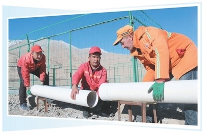 穆薩·克日木(中)和工友修復(fù)大橋排水管道。 王有文攝