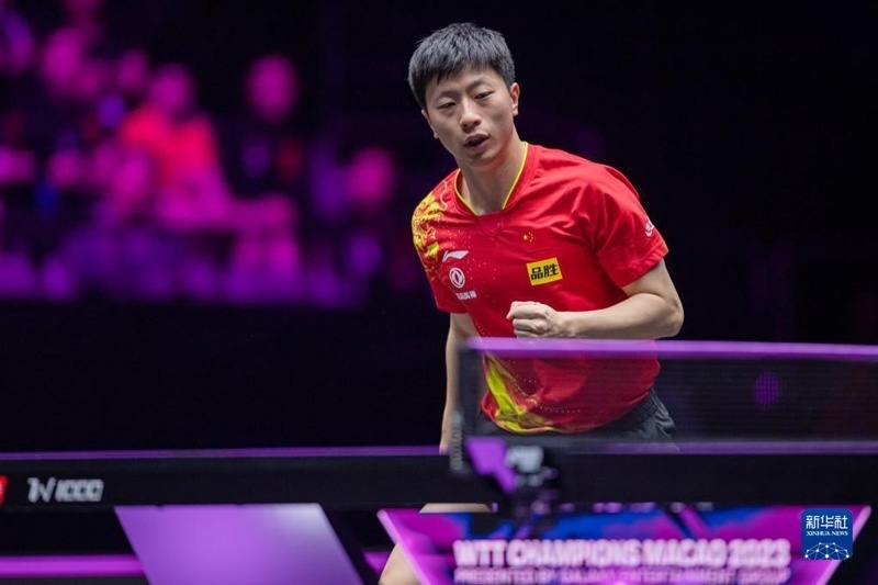 2023年4月22日,馬龍?jiān)诒荣愔?。?dāng)日,在澳門塔石體育館舉行的2023世界乒乓球職業(yè)大聯(lián)盟(WTT)澳門冠軍賽男子單打半決賽中,中國(guó)選手馬龍以4比1戰(zhàn)勝法國(guó)選手艾利克斯·勒布倫,晉級(jí)決賽。新華社記者 張金加攝