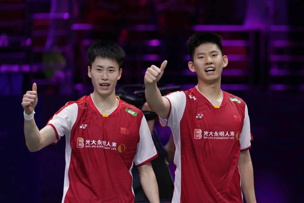 5月20日,中國隊(duì)組合劉雨辰/歐烜屹(右)在男雙比賽后慶祝。