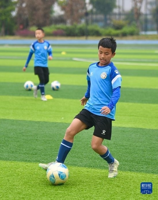 在瀘州天立春雨學(xué)校足球場(chǎng),來自涼山彝族自治州的楊坤在進(jìn)行訓(xùn)練(3月29日攝)。