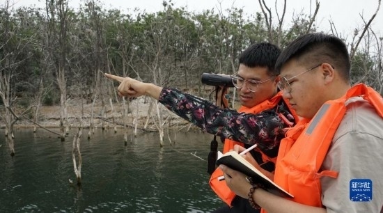 北京市水務(wù)局密云水庫管理處水生態(tài)管護(hù)員在觀察和記錄候鳥育雛情況(5月31日攝)。