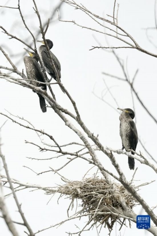 準(zhǔn)備學(xué)習(xí)飛翔的幾只鸕鶿幼鳥棲息在密云水庫“鳥島”的樹上(5月31日攝)。