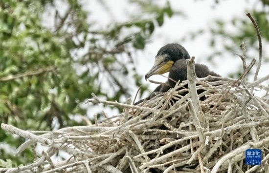 密云水庫“鳥島”上一只鸕鶿幼鳥在窩中休息(5月31日攝)。