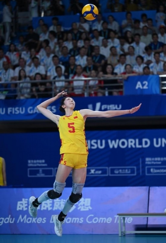 8月6日,吳夢潔在第31屆世界大學(xué)生夏季運動會女子排球金牌賽中發(fā)球。新華社記者 胥冰潔 攝