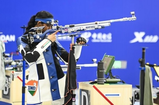 2023年7月29日,印度隊(duì)選手瓦拉里萬以252.5環(huán)的總成績獲得第31屆世界大學(xué)生夏季運(yùn)動會女子10米氣步槍冠軍。新華社記者 曹祎銘 攝