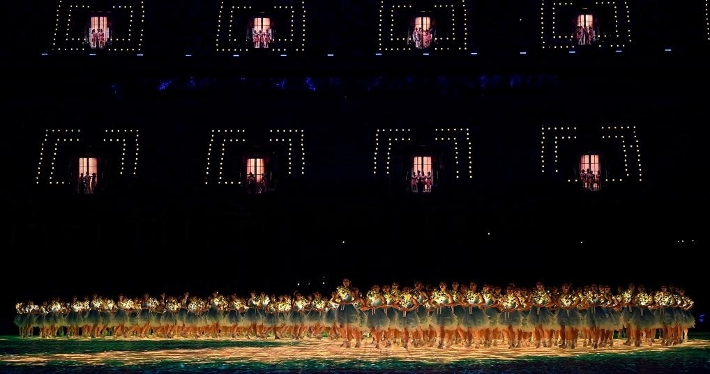 歌聲高潮處,觀眾席中近百扇“幸福之門”同時開啟。全場萬人合唱,現場每一名觀眾都成為開幕式“主角”,傳達“亞洲一家攜手同行”的美好愿望。
