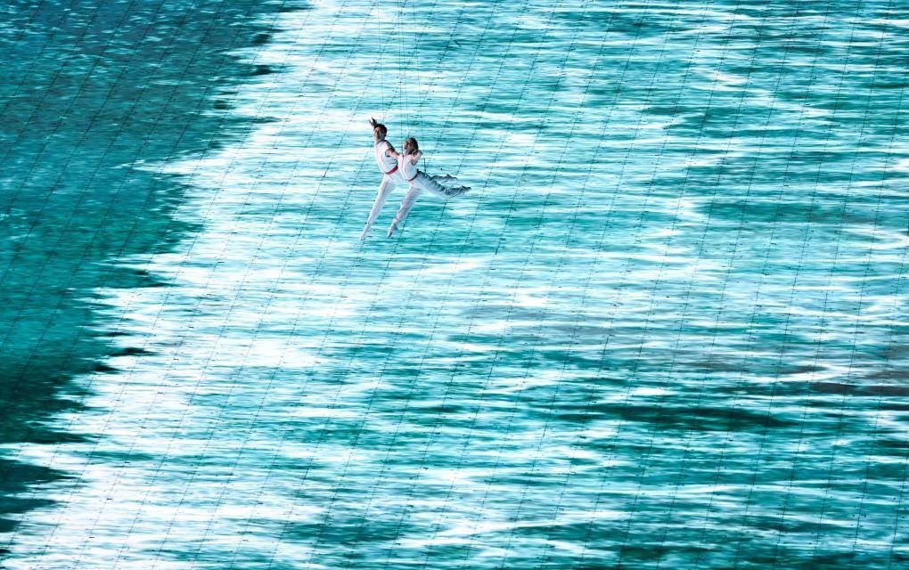 本屆亞運會首次將3D雙威亞技術應用于大型運動場中。立體飛旋于空中的男女演員與潮共舞,吊著威亞的他們在空中完成了各種高難度動作,并與地屏中的浪潮實時互動,踏浪而行,成就了科技與藝術完美融合。