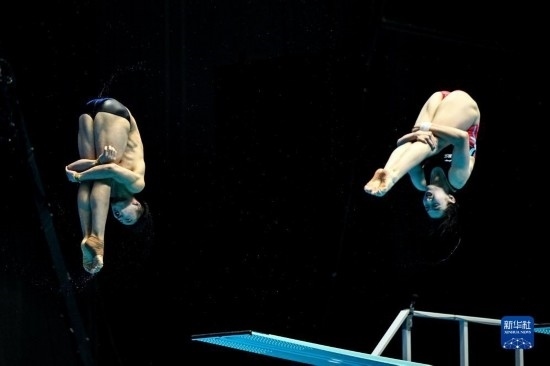 7月18日,中國選手掌敏潔(左)/白鈺鳴在混合十米臺比賽中。