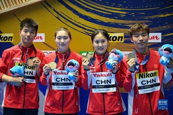 當(dāng)日,在日本福岡舉行的2023年世界游泳錦標(biāo)賽跳水混合團(tuán)體決賽中,中國隊以489.65分奪冠。