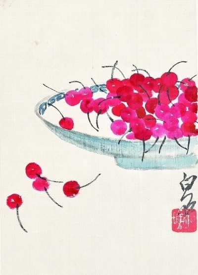展柜中,不大的冊頁引得眾人圍觀。顆顆櫻桃被齊白石描繪得鮮嫩欲滴,它們擠在一個素樸的青花瓷盤中,還有幾顆散落在外,尤其鮮亮奪目?!侗P中櫻桃》是齊白石《聚珍十開冊》中的一幅,作于20世紀30年代。在這套冊頁中,無論是荷花游魚、麥穗螞蚱還是汀渚魚鷹,都在齊白石筆下顯得格外逼真?zhèn)魃瘛?/p>
