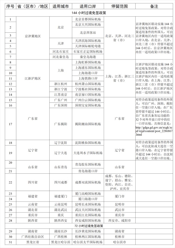 如外國人符合上述條件,可向我國20個城市的邊檢機(jī)關(guān)提出辦理144小時過境免簽申請,或向3個城市的邊檢機(jī)關(guān)提出辦理72小時過境免簽申請,其他城市暫未實(shí)施該項(xiàng)政策。