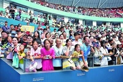 9月29日,杭州亞運(yùn)會網(wǎng)球女子單打決賽現(xiàn)場,觀眾在歡呼。本報記者陳城攝 光明圖片