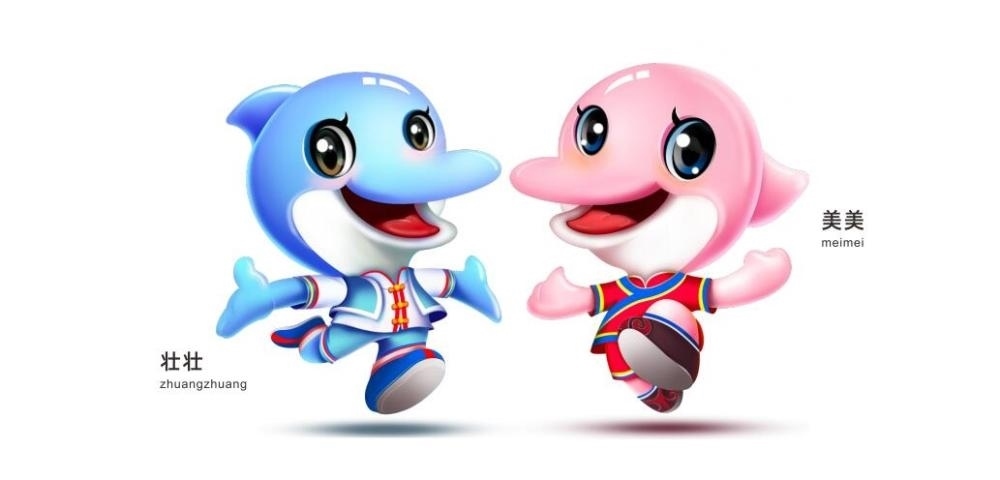 首屆學(xué)青會吉祥物“壯壯”“美美”,是一對活潑律動的海豚形象,以中華白海豚為原型創(chuàng)作,搭配壯錦和民族服飾,凸顯廣西的民族特色和地域風(fēng)格。