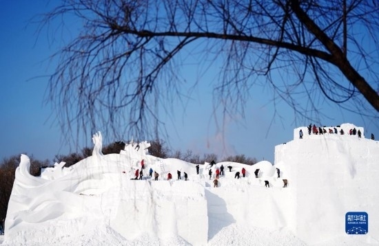 12月19日,雪雕師在創(chuàng)作雪雕作品《萬(wàn)象更新》。
