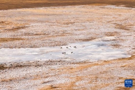 阿爾金山國家級(jí)自然保護(hù)區(qū),一群藏羚在冰河上(無人機(jī)照片,12月22日攝)。