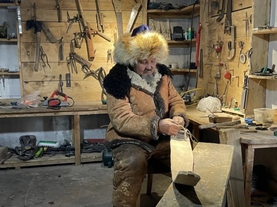 從將軍山滑雪場(chǎng)駕車(chē)一路向北,20分鐘左右就到了拉斯特鄉(xiāng)。記者到訪時(shí),69歲的斯蘭別克·沙和什和兒子胡安什別克·斯蘭別克正在作坊里制作毛皮滑雪板。
