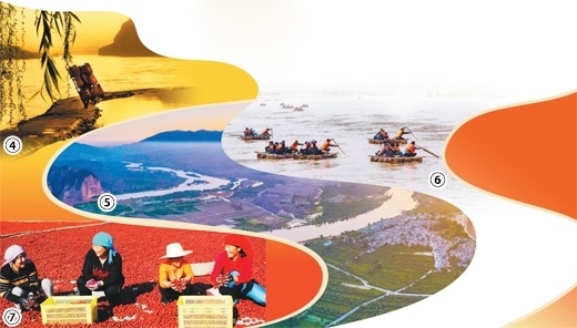圖④:一名筏工背著羊皮筏子前行。圖⑤:黃河岸邊的龍灣村。圖⑥:游客們?cè)邶垶炒甯浇俗蚱しぷ印D⑦:龍灣村村民喜迎紅棗豐收。圖均為宋朝軍、俞寶榮攝影報(bào)道