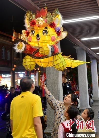 圖為2月20日晚,家長(zhǎng)帶著小孩在泉州中山路賞燈。中新網(wǎng)記者 張斌 攝
