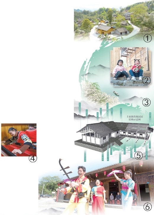 圖①:俯瞰龍鳳壩鎮(zhèn)大寨村。圖②:孩童們坐在龍鳳壩鎮(zhèn)大寨村的古民居前。圖③:大溪鄉(xiāng)前進村的臨水風光。圖④:在龍鳳壩鎮(zhèn)大寨村,村民正制作土家織錦。圖⑤:土家族傳統(tǒng)民居結構示意圖。張丹峰繪 圖⑥:在溪口鎮(zhèn)黃楊扁擔村,村民們演唱秀山民歌《黃楊扁擔》。圖①②③④⑥均為沈靖然、胡程攝影報道