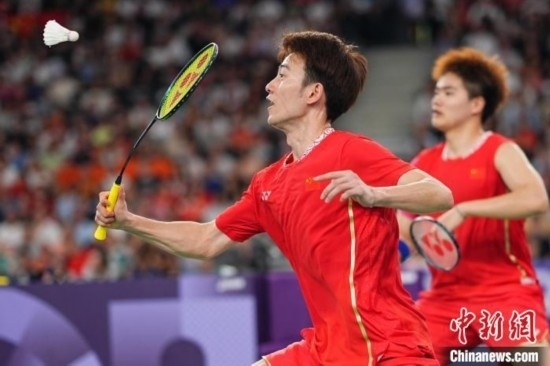 資料圖:當(dāng)?shù)貢r間8月4日,在巴黎奧運(yùn)會羽毛球男子雙打決賽中,中國組合梁偉鏗/王昶奪得銀牌。圖為梁偉鏗/王昶(前)在比賽中。 記者 趙文宇 攝
