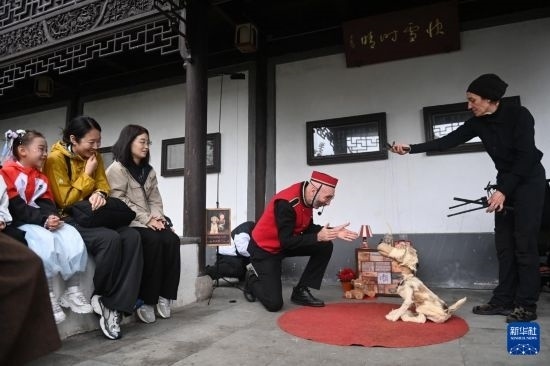10月27日,來自意大利的藝術表演者在南潯古鎮(zhèn)宜園為游客表演輕喜偶劇。