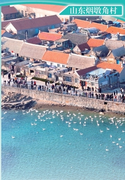 山東榮成市煙墩角村是亞洲最大的天鵝越冬棲息地,這個依山傍海的小漁村中建有傳統(tǒng)民居海草房。圖為游客們在煙墩角村觀賞天鵝。楊志禮攝(影像中國)
