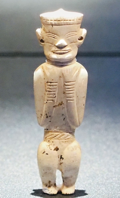 凌家灘遺址共出土6件完整的玉人,3件為立姿,3件為坐姿,此次展出其中4件。玉人皆為方臉,以陰線刻出“介”字形方格紋冠,兩耳垂處各有一圓形鉆孔,以示穿戴耳飾之用,腰間雕出斜紋帶飾。除姿勢不同外,6件玉人的差異在于腕部陰刻的手鐲數(shù)量不同,分別有5個、6個、7個。它們背后都有斜向?qū)︺@的穿孔,可穿綴在特定載體上作為祭祀禮器使用??讖絻H1.5毫米左右,表明當(dāng)時的鉆孔技術(shù)已達(dá)到令人驚嘆的程度。玉人服飾精美,表情莊重,雙臂貼胸,十指分開,似為禮神致敬之姿,可能表現(xiàn)了凌家灘高等級貴族中巫師的形象。