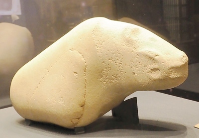 此次展覽以多媒體形式介紹了這座“王者之墓”的形制和隨葬品,并展示了墓中出土的重要文物。玉石豬是目前國內(nèi)考古發(fā)現(xiàn)的同時代最大、最重的玉雕作品。豬拱部凸出,其上有兩個鼻孔,嘴兩側(cè)刻上彎的獠牙,應(yīng)為野豬形態(tài)。眼和豎耳用減地法表現(xiàn),頸部寬而淺,腹部一側(cè)刻兩條彎曲的線,象征蜷曲的雙腿。這件大玉豬發(fā)現(xiàn)于墓口上方而不是墓底,可能有某種指示或鎮(zhèn)墓功能。