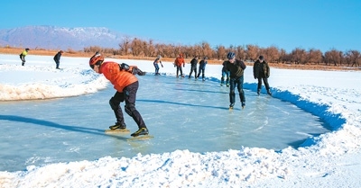 滑冰愛(ài)好者在甘肅省張掖國(guó)家濕地公園滑冰健身。