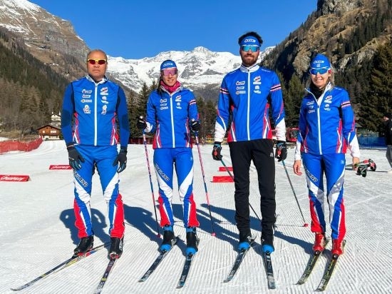 2022年1月24日,泰國越野滑雪隊運動員卡倫·尚?。ㄗ蠖?、馬克·尚?。ㄗ笕┡c父母在歐洲備戰(zhàn)訓(xùn)練時合影。新華社發(fā)(受訪者供圖)