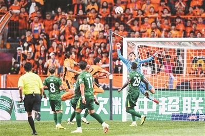 北京國(guó)安隊(duì)門(mén)將韓佳奇(上右)在比賽中撲救。