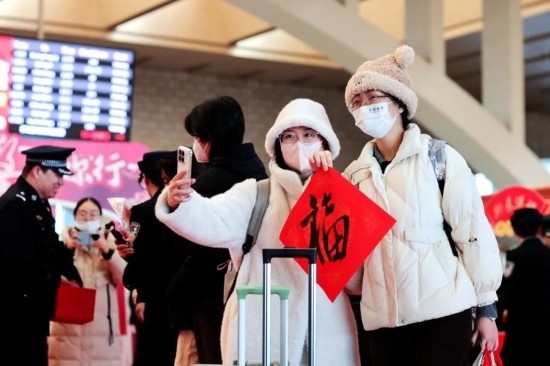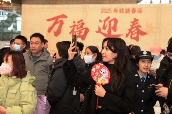 2025年鐵路春運(yùn)“萬福迎春”活動(dòng)現(xiàn)場,一位外籍旅客自拍留念。