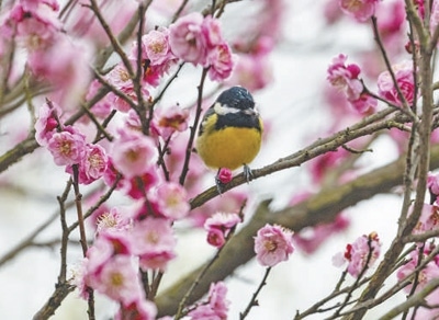 一只黃腹山雀停留在梅花“粉紅朱砂”枝頭。